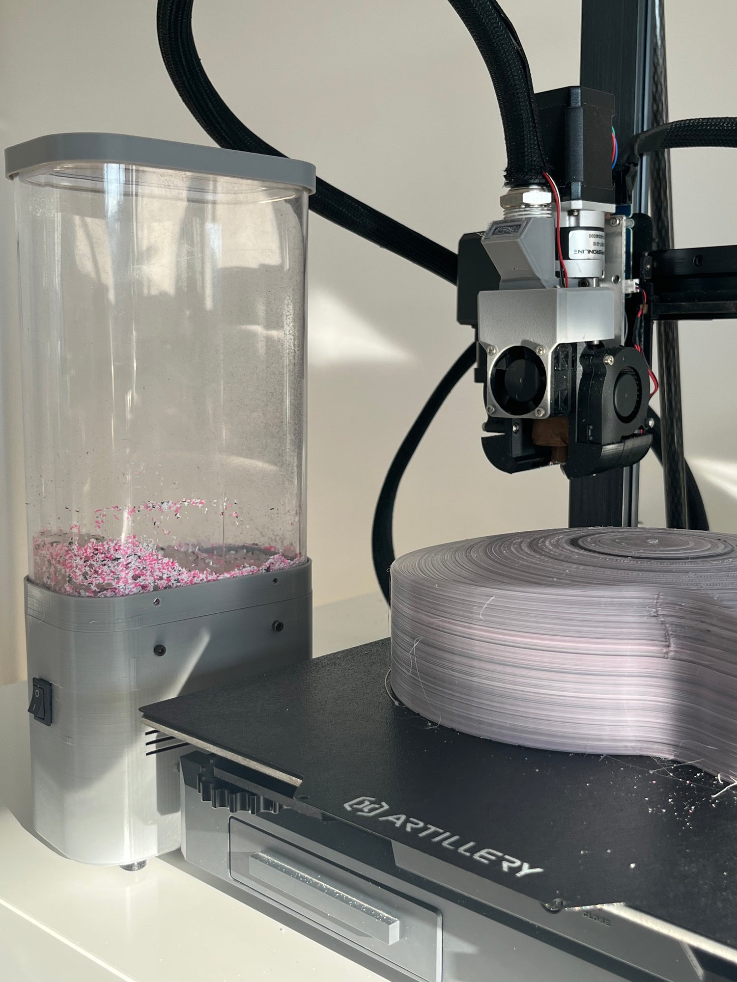 ReFusion is an innovative 3D printer that allows you to print using 100% shredded plastics, eliminating the need for traditional filament. It enables the reuse of plastic waste, transforming discarded materials into new, functional parts.´