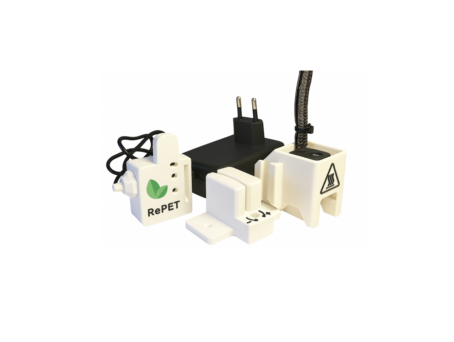 RePET is an innovative 3D printing accessory compatible with all FDM Cartesian Direct Drive 3D printers that allows you to 3D print directly using recycled plastic bottles, eliminating the need for traditional filament. It cuts each bottle into a continuous strip, then heats and shapes it as it feeds into the extruder.