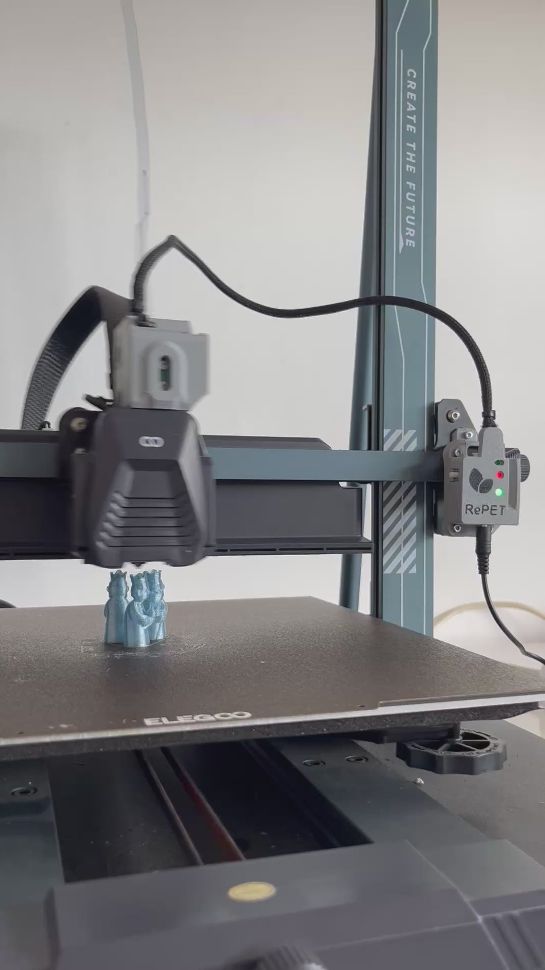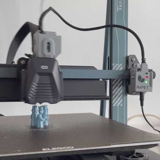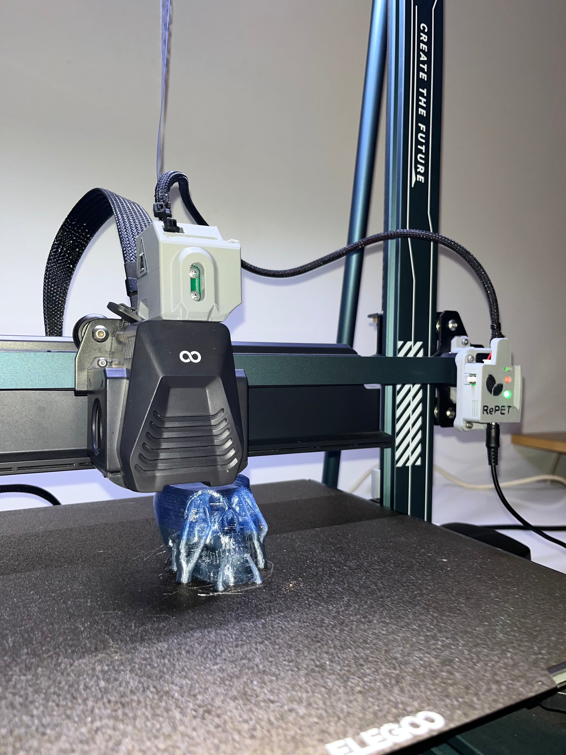 Once inserted into the heated head, the plastic strip melts and is transformed into filament in real time, using the 3D printer’s own extruder. As the printer moves and extrudes material, it continuously converts the plastic strip into usable filament — printing and recycling simultaneously.